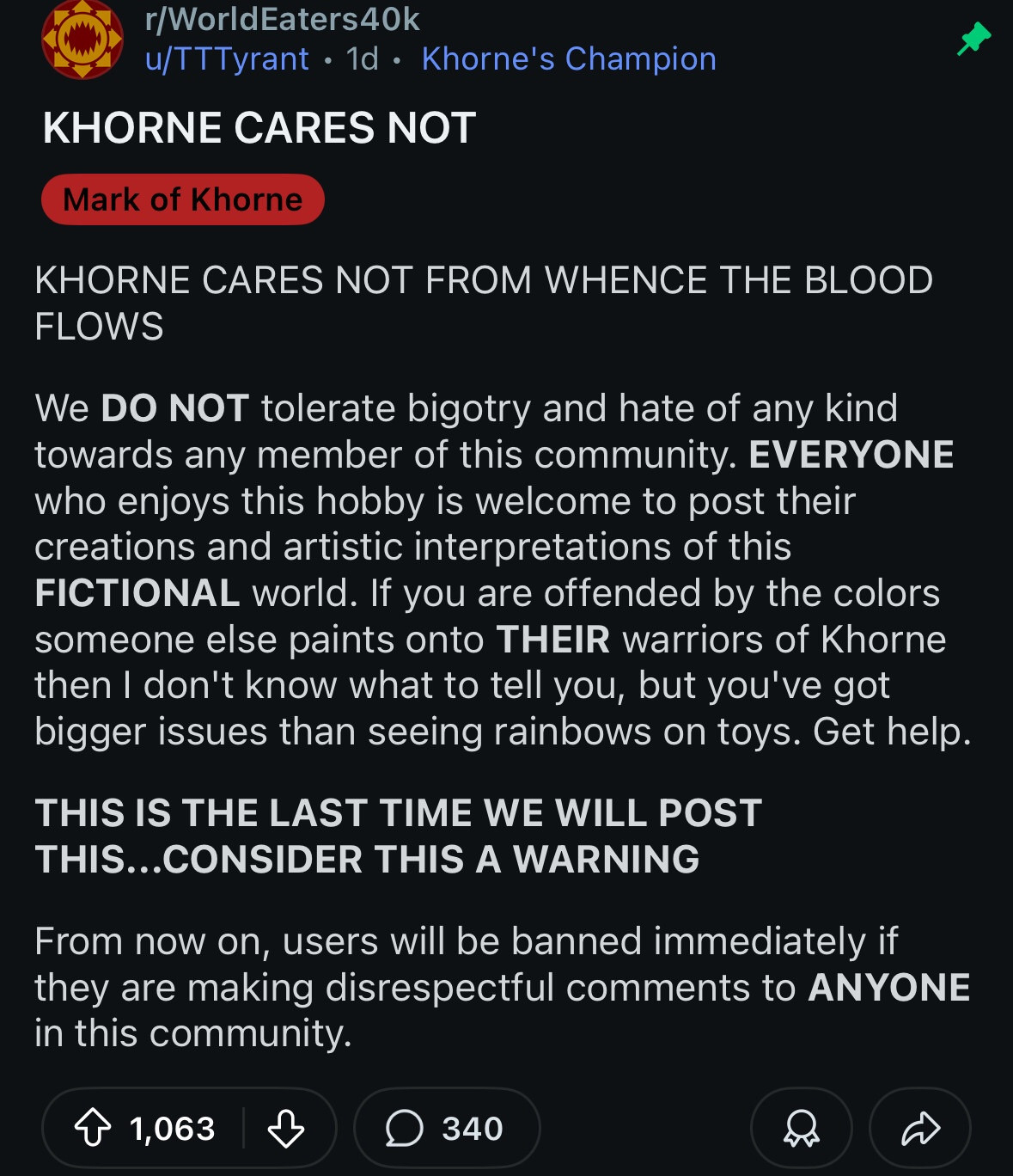 This was the response of a forum admin who had been pushed to the brink of sanity because some people had painted their Bloodletters (a cult dedicated to the Chaos God of Battle and Murder, the Chaos Gods are sort of the bad guys, but also everyone is basically the bad guys) with rainbows and other people got VERY UPSET about that.